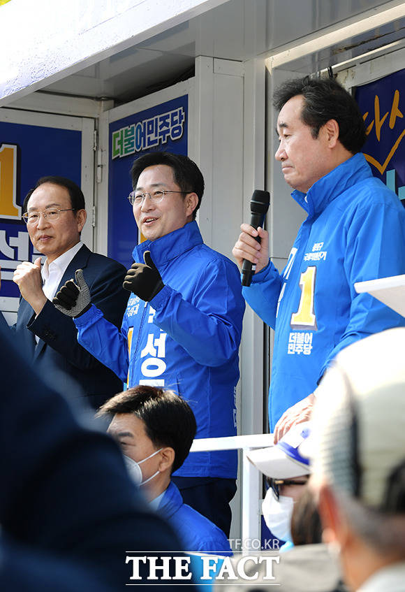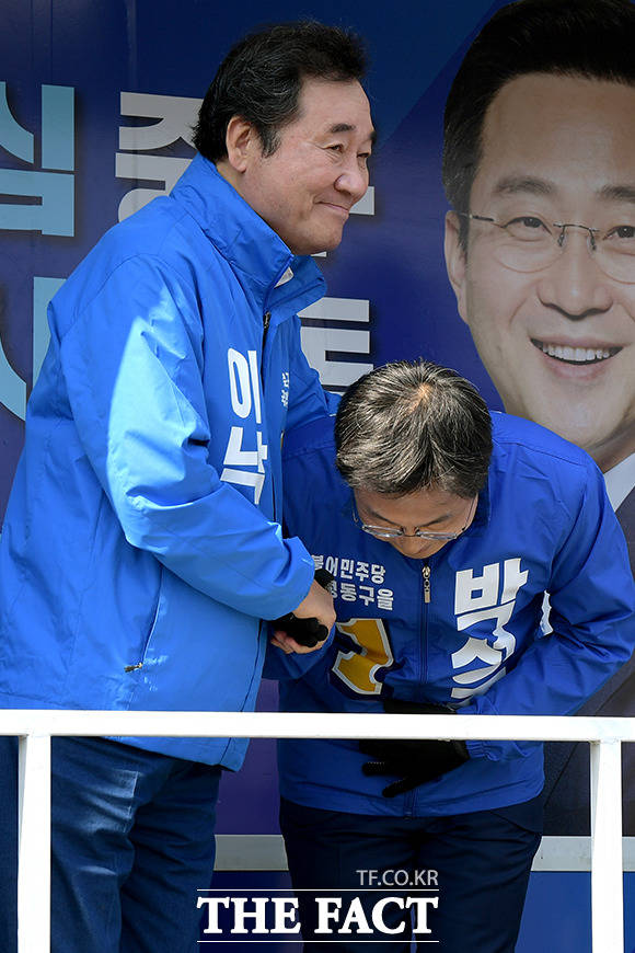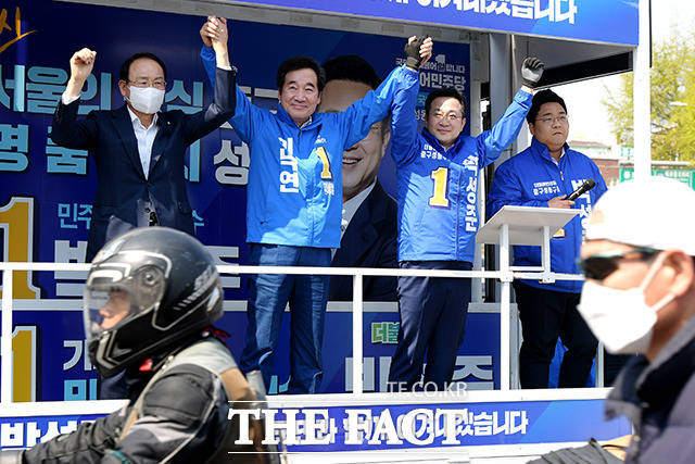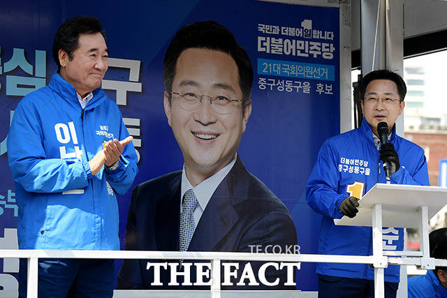 [더팩트|이선화 기자] 박성준 중구성동구을 국회의원 후보가 14일 오후 서울 종로구 마전교 인근에서 이낙연 더불어민주당 공동상임선대위원장이자 종로구 국회의원 후보와 합동 유세를 마치고 주민들과 인사를 나누고 있다.