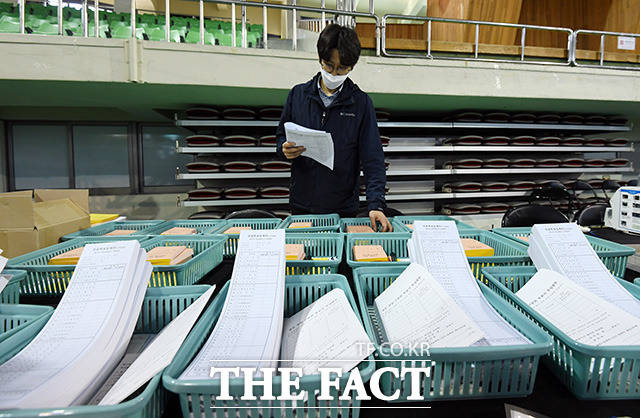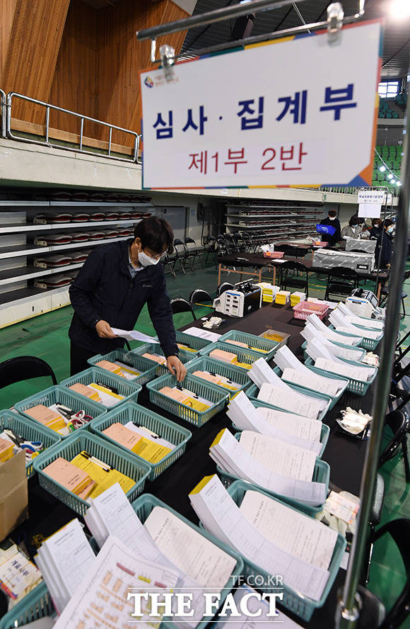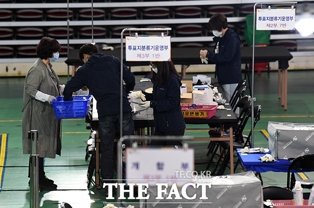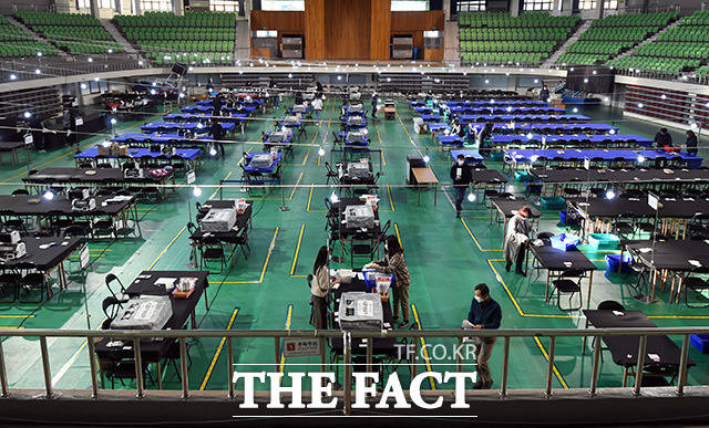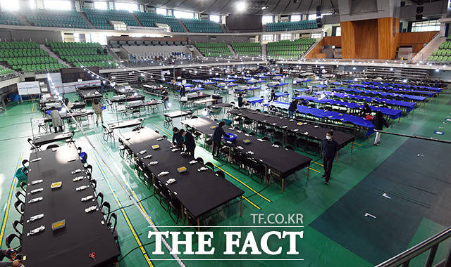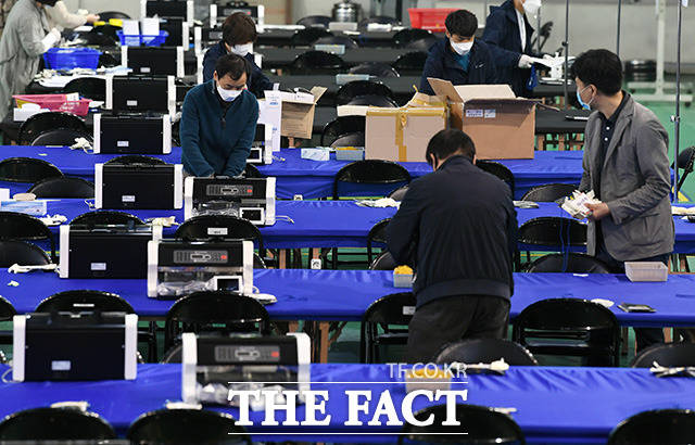 [더팩트ㅣ대구=임영무 기자] 4.15 총선 투표일을 하루 앞둔 14일 오후 대구시 북구 산격동 대구체육관에 마련된 개표소에서 관계자들이 개표 장비들을 점검하고 있다.