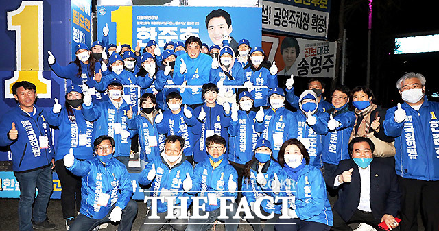 [더팩트ㅣ이효균 기자] 4일 오후 경기 고양시 행신동 사거리에서 한준호 더불어민주당 고양시(을) 국회의원 후보가 공식선거운동 기간 동안 1일 5만 보, 총 65만 보 걸어 시민과 함께 하는 합동유세로 13일 간의 공식선거운동을 마무리 하며 선거운동원들과 기념촬영을 하고 있다.