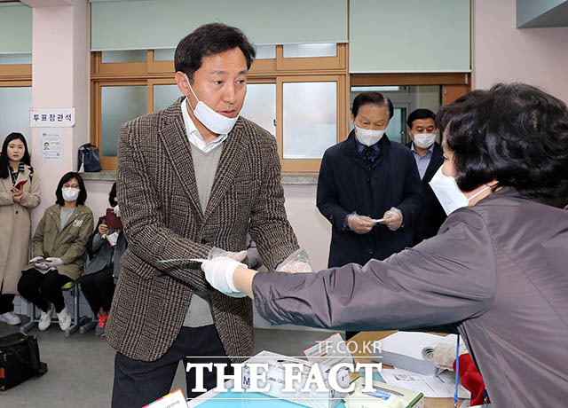 [더팩트ㅣ김세정 기자] 제21대 국회의원 선거일인 15일 오전 광진을에 출마한 고민정 더불어민주당 후보(왼쪽)와 오세훈 미래통합당 후보가 각각 광진구민방위교육센터와 신양초등학교에서 투표하고 있다.