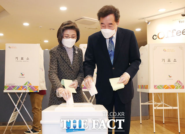 [더팩트 | 남윤호 기자] 이낙연 더불어민주당 종로 후보(오른쪽)와 배우자 김숙희 씨가 15일 서울 종로구 교남동 제3투표소에서 제21대 국회의원선거 투표를 하고 있다.