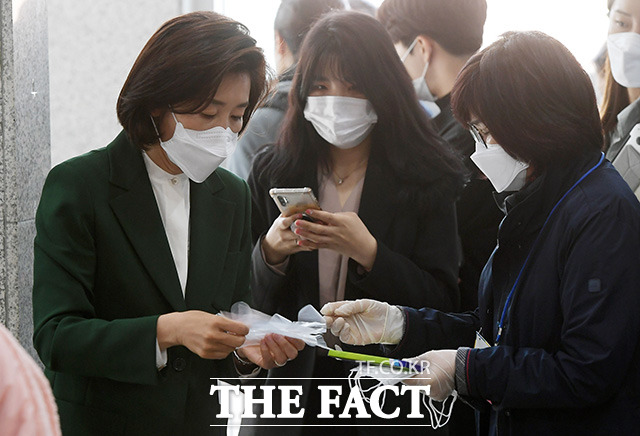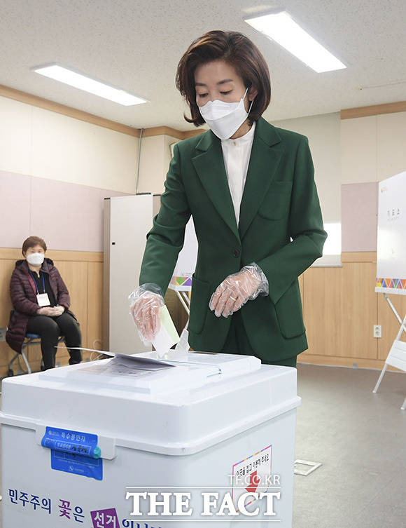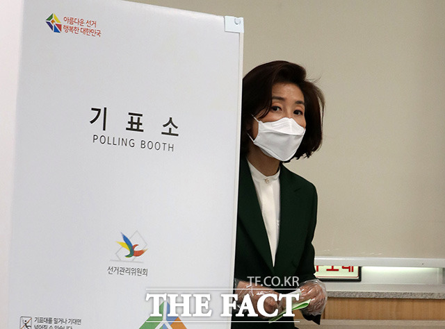 [더팩트ㅣ이동률 기자] 제21대 국회의원 선거날인 15일 오전 나경원 미래통합당 동작을 후보와 나 후보의 딸, 남편인 김재호 서울고법 부장판사(왼쪽부터)가 사당 제1동 제5투표소를 찾아 투표를 마치고 이동하고 있다.