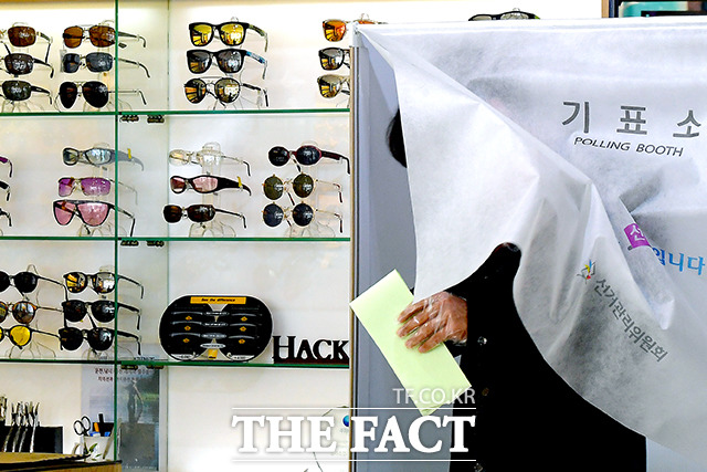 [더팩트|이선화 기자] 제21대 국회의원 선거일인 15일 오후 서울 광진구 화양동 으뜸안경원에 마련된 제5투표소에서 유권자들이 투표를 하고 있다.