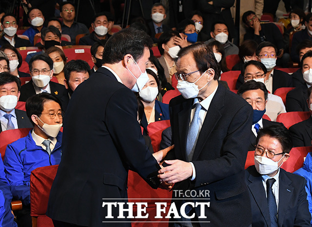 [더팩트ㅣ국회=배정한 기자] 이낙연 더불어민주당 상임선대위원장(왼쪽)과 이해찬 대표가 15일 오후 서울 여의도 국회 의원회관 대회의실에 마련된 더불어민주당 제21대 국회의원 선거 개표상황실에서 만나 악수를 하고 있다. hany@tf.co.kr 사진영상기획부 photo@tf.co.kr