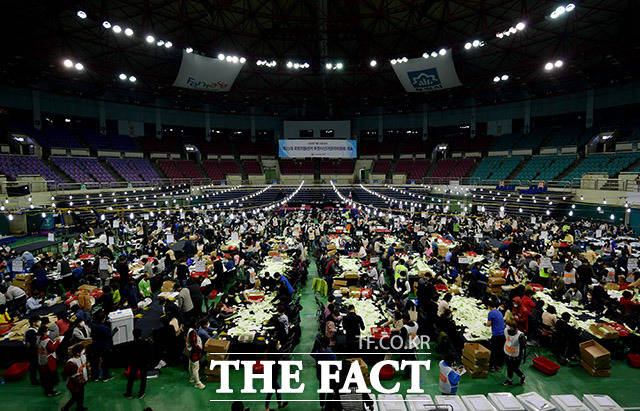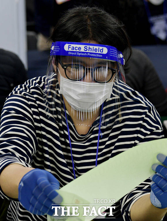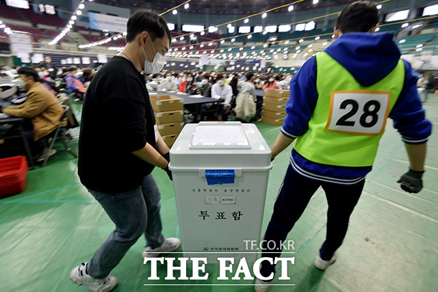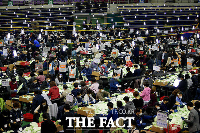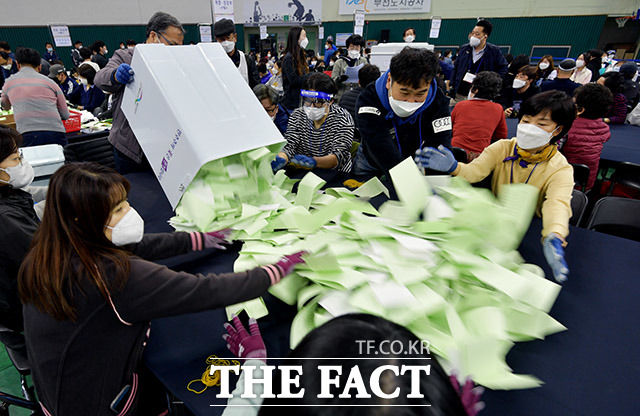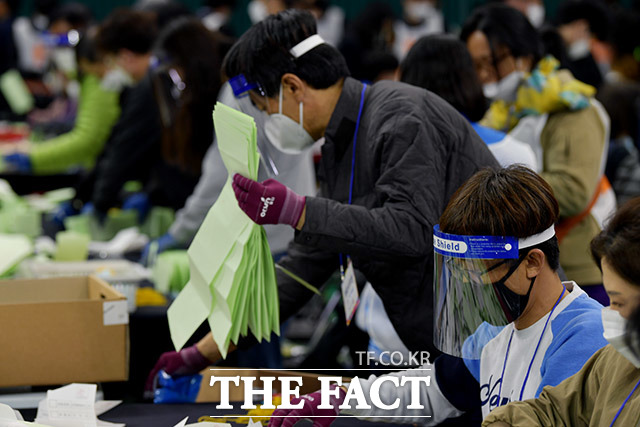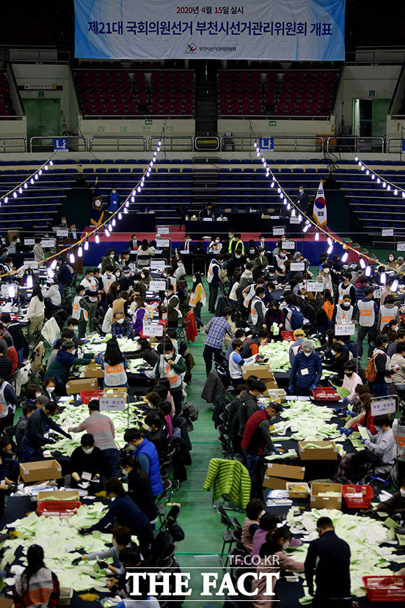 [더팩트ㅣ부천=이덕인 기자] 21대 국회의원선거가 종료된 15일 오후 경기 부천체육관에 마련된 개표소에서 개표가 진행되고 있다.