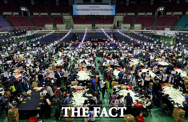 21대 국회의원선거가 종료된 15일 오후 경기 부천체육관에 마련된 개표소에서 개표가 진행되고 있다. /부천=이덕인 기자