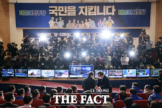 [더팩트ㅣ국회=배정한 기자] 이낙연 상임선대위원장과 이해찬 대표(왼쪽)가 15일 오후 서울 여의도 국회 의원회관 대회의실에 마련된 더불어민주당 제21대 국회의원 선거 개표상황실에서 악수를 하고 있다. hany@tf.co.kr 사진영상기획부 photo@tf.co.kr