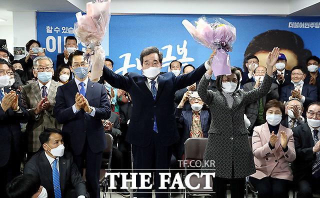 [더팩트ㅣ이효균 기자] 이낙연 더불어민주당 서울 종로구 국회의원 후보가 15일 선거사무소 상황실에서 21대 국회의원선거 당선이 확실시 되자 부인 김숙희 여사와 꽃다발을 들고 있다.