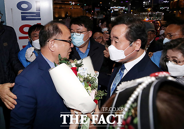 [더팩트ㅣ이효균 기자] 이낙연 더불어민주당 서울 종로구 국회의원 후보가 15일 오후 21대 국회의원선거 당선이 확실시 되자 선거 캠프로 들어서고 있다.