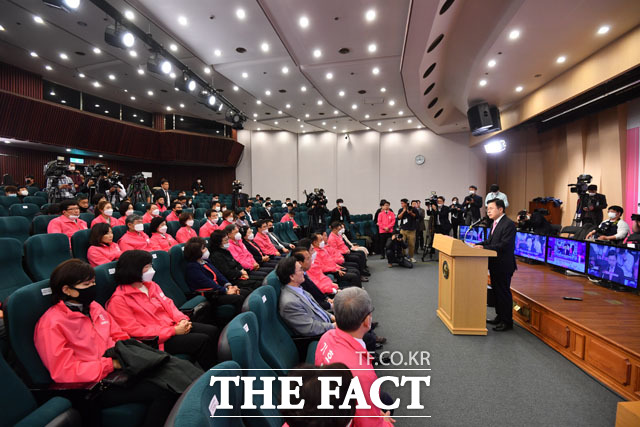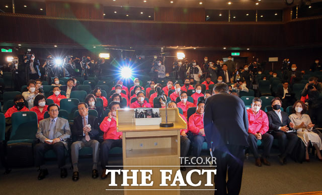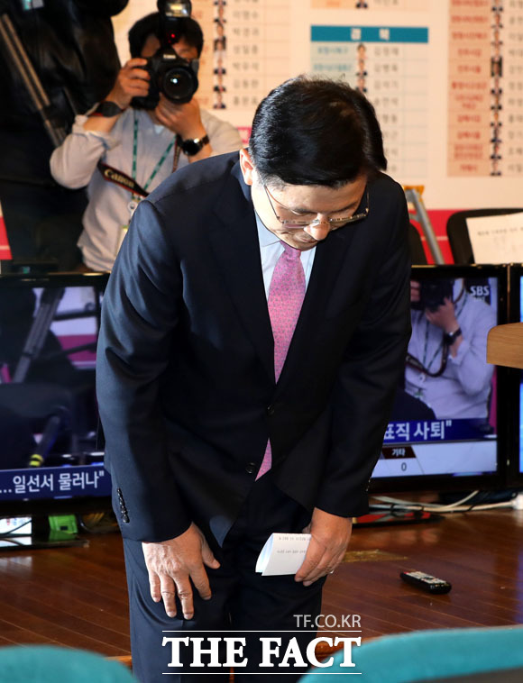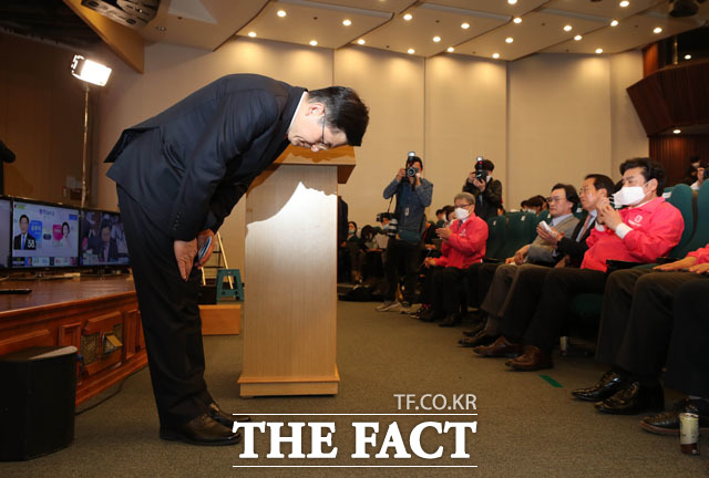 [더팩트 | 국회=남윤호 기자] 황교안 미래통합당 총괄선대위원장이 15일 오후 서울 여의도 국회도서관에 마련된 제21대 국회의원 선거 개표상황실에서 당직 사퇴를 발표한 뒤 고개를 숙이고 있다.