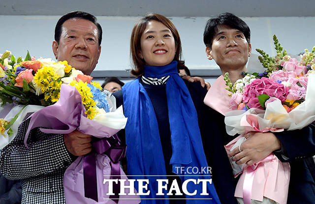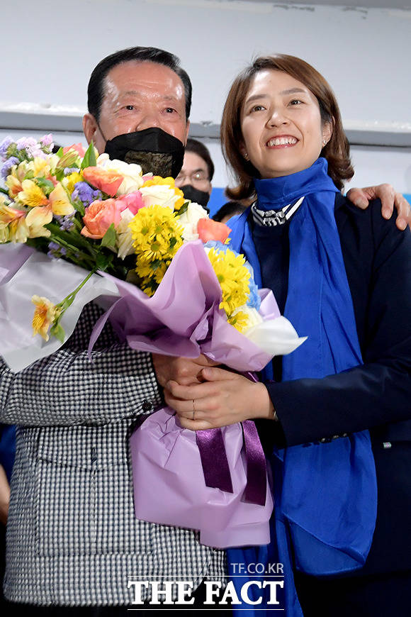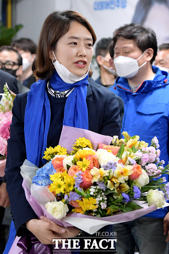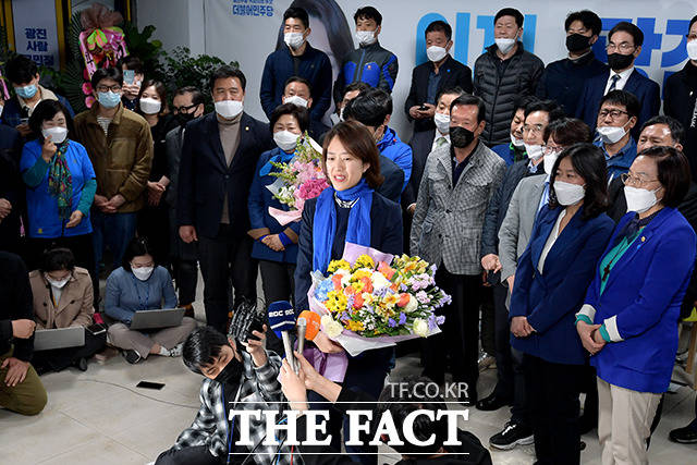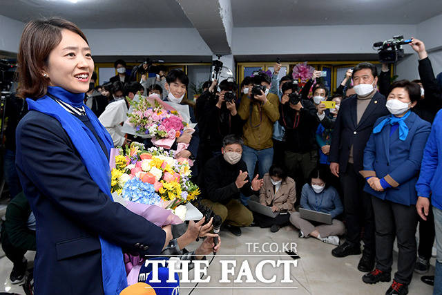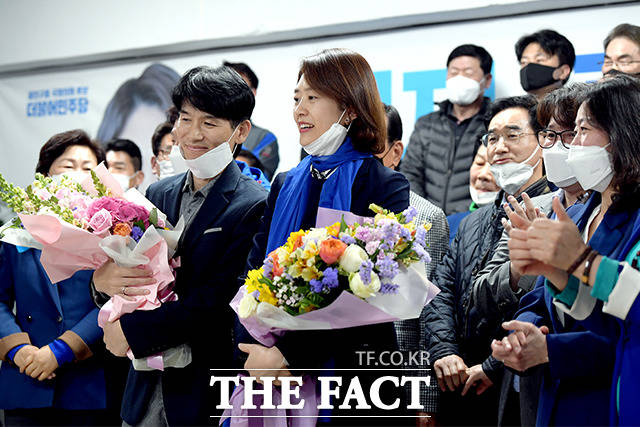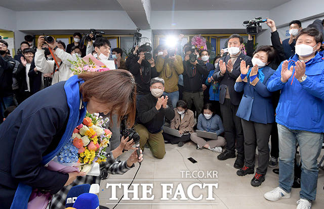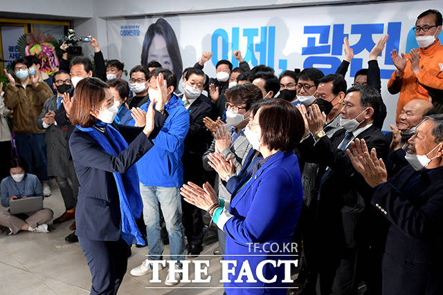 [더팩트|이선화 기자] 고민정 더불어민주당 광진을 국회의원 후보(왼쪽)가 제21대 국회의원 선거 당선이 유력해지자 16일 새벽 서울 광진구 후보자 사무소를 방문해 지지자들과 함께 기쁨을 나누고 있다.