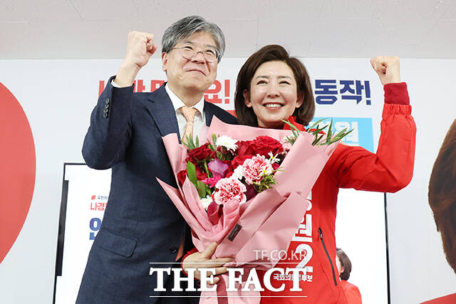 [더팩트ㅣ장윤석 기자] 나경원 국민의힘 서울 동작을 후보가 12일 오후 서울 동작구에 위치한 선거사무소 개소식에서 남편 김재호 서울고등법원 부장판사로부터 꽃다발을 받고 있다.