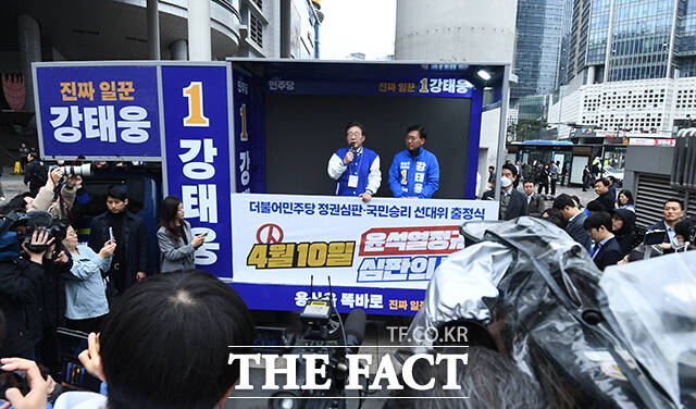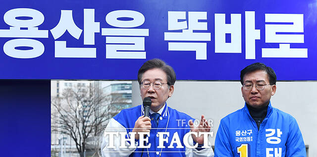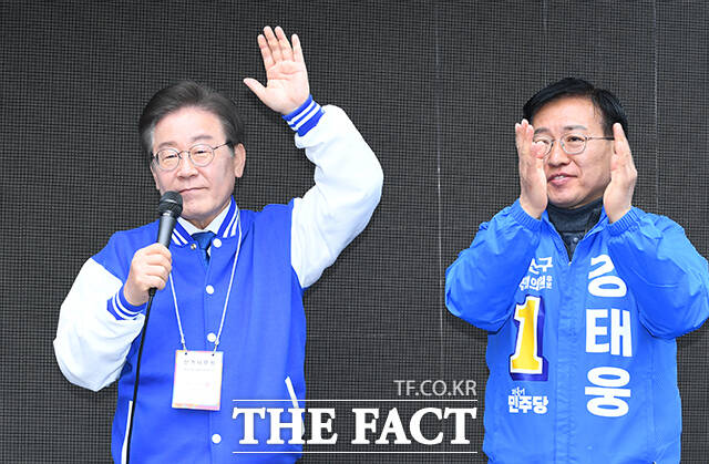 [더팩트ㅣ이동률 기자] 4.10 총선 공식 선거운동 첫날인 28일 오전 이재명 더불어민주당 대표가 서울 용산구 용산역 광장에서 열린 선대위 출정식에 참석해 강태웅 서울 용산 후보와 함께 지지를 호소하고 있다.