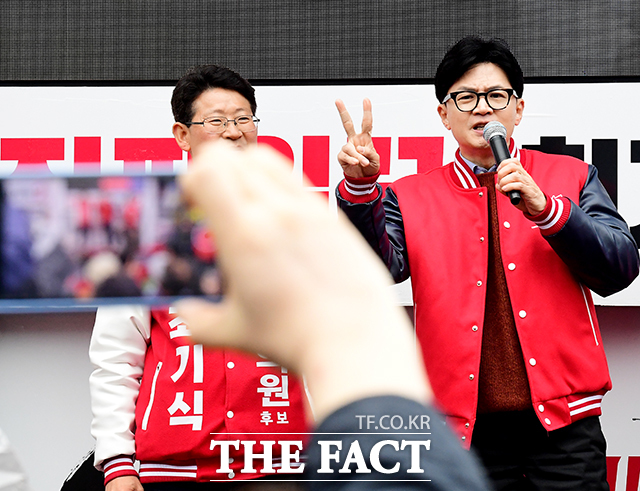 [더팩트ㅣ의왕=배정한 기자] 한동훈 국민의힘 비상대책위원장 겸 총괄선거대책위원장(오른쪽)이 29일 오전 경기 의왕시 부곡시장에서 시민들을 만나 최기식 의왕·과천시 국회의원 후보의 지지를 호소하고 있다.hany@tf.co.kr사진영상기획부 photo@tf.co.kr