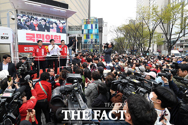 [더팩트ㅣ남용희 기자] 김병민 국민의힘 광진구갑 후보와 한동훈 비상대책위원장, 오신환 광진구을 후보(왼쪽부터)가 4일 오후 서울 광진구 건대스타시티점 앞에서 시민들에게 지지를 호소하고 있다.