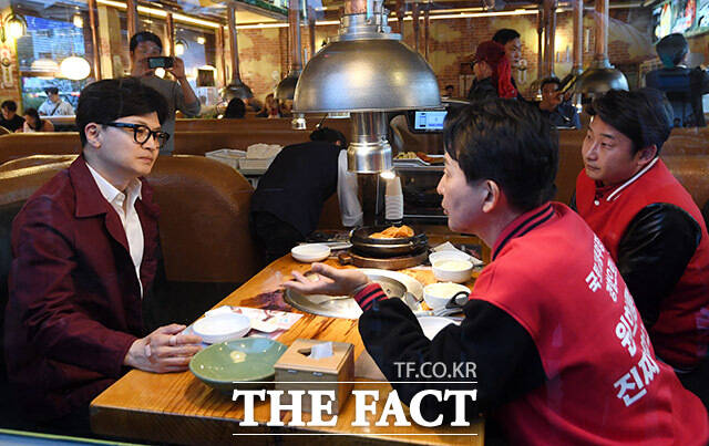 [더팩트ㅣ인천=남용희 기자] 한동훈 국민의힘 비상대책위원장(왼쪽)이 8일 오후 인천시 계양구에 위치한 한 식당에서 원희룡 계양을 후보와 이천수 후원회장과 식사를 하며 대화를 나누고 있다.