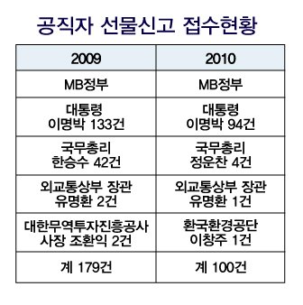 문제는 2009년에도 ‘공직자 선물신고 제도’가 유명무실하게 운영되었다는 점이다. 실제로 2009년 전체 신고 수 178건 중 이명박 대통령이 132건, 한승수 전 국무총리가 42건을 신고했다.