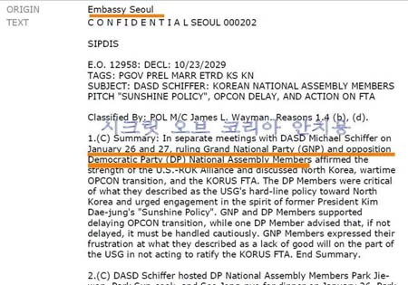주한미국대사관은 이 전문에서 박 원내대표가 민주당내 대표적 보수주의자인 서종표 의원을 이날 만찬에 초대했으며 서 의원은 북한핵문제는 오로지 김정일체제가 붕괴할 때만 해결될 수 있다고 말했습니다. 이에 박 원내대표는 서 의원이 강경보수론자라고 말해 좌중에 웃음이 일었다고 기록했습니다.