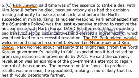 박지원 민주당 원내대표가 지난해 1월 이명박 대통령과 북한 김정일 간의 남북정상회담을 지지한다는 뜻을 미국측에 밝힌 것으로 위키리크스가 폭로한 미국무부 비밀전문을 통해 밝혀졌습니다.