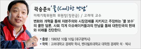 우리 시대의 리더와 이슈메이커들은 어떤 생각을 갖고 현재를 살고 있는가. 또 어떻게 미래를 설계하고 있는가. "따분한 보수는 가라"며 '쿨 보수'의 아이콘으로 떠오른 곽승준(52) 대통령 직속 미래기획위원회 위원장(장관급)이 변화와 개혁의 소용돌이 속에서 자신만의 색깔을 드러내고 있는 사람들과 특별한 만남을 갖는다. 20~40대가 주 독자층을 형성하고 있는 <더팩트>과 '쿨한 융합'이라는 목표를 향해 힘차게 나아가고 있는 곽승준이 펼치는 색깔 있는 대화는 이슈메이커들의 또 다른 면모를 볼 수 있는 새로운 장이 될 것이다. <편집자 주>