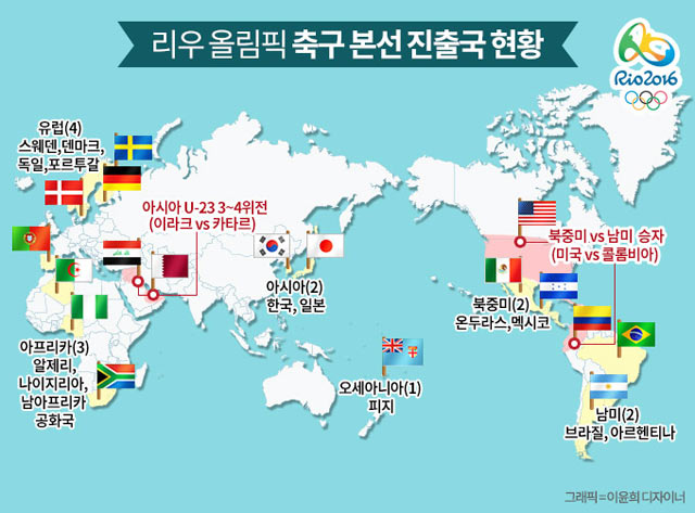 [더팩트|김광연 기자] 한국 23세 이하(U-23) 축구 국가 대표팀이 14번째로 2016 리우데자네이루 올림픽 본선 진출을 확정했습니다. 이번 리우 올림픽 본선 축구엔 총 16개국이 참가합니다. 29일(한국 시각) 현재 티켓은 단 두 장만이 남았습니다. 대륙별로 유럽에선 독일, 포르투갈, 스웨덴, 덴마크가 올림픽에 참가합니다. 남미는 '개최국' 브라질과 아르헨티나가 나서고 북중미는 멕시코와 온두라스가 경기를 뜁니다. 아프리카는 알제리, 나이지리아, 남아프리카공화국이 참여하고 오세아니아는 피지가 올림픽 무대를 누빕니다. 남은 두 장은 29일 열리는 AFC U-23 챔피언십 3, 4위전에서 맞붙는 이라크-카타르전 승자와 3월 열리는 북중미 남미 플레이오프 미국-콜롬비아 승자가 따내게 됩니다.