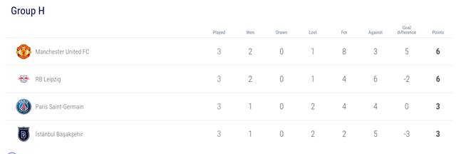 반대로 지난달 30일 라이프치히에 5-0 대승을 거둔 맨유는 터키 원정에서 2패의 바샥셰히르에 전반 13분 만에 선제골을 내주는 등 전반에만 0-2로 끌려가며 고전을 면치 못하다가 결국 1-2로 패했다. 맨유는 올 시즌 챔피언스리그 첫 패배와 함께 2승1패(승점 6점)로 라이프치히(승점 6점)와 동률을 기록한 뒤 골득실에서 앞서 간신히 조 선두를 이어갔다.