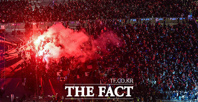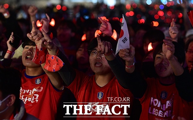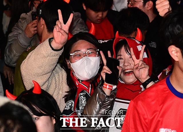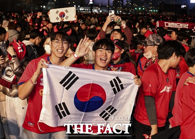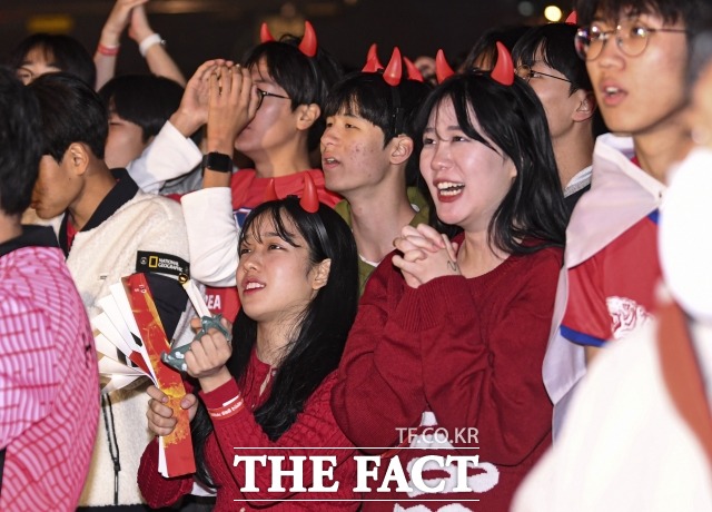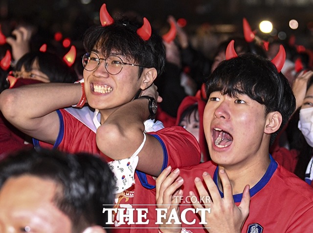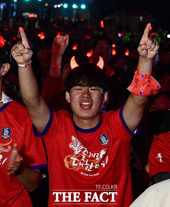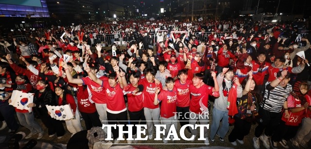 [더팩트ㅣ이동률 기자] 2022 카타르 월드컵 H조 조별리그 1차전 대한민국과 우루과이의 경기가 열린 24일 오후 서울 광화문광장에서 붉은악마 응원단과 시민들이 거리응원을 하고 있다.