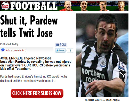 30일(한국시간) 영국 '더 선' 등 보도에 따르면 "지난 29일(한국시간) 토트넘 원정을 준비하던 뉴캐슬 유나이티드 앨런 파듀 감독은 주전 수비수 호세 엔리케의 부상으로 선수 기용의 변화를 꿰해야 했다"며 "파듀 감독은 엔리케의 부상 소식을 언론에 알리지 않고 경기에 나서고자 했다"고 밝혔다.