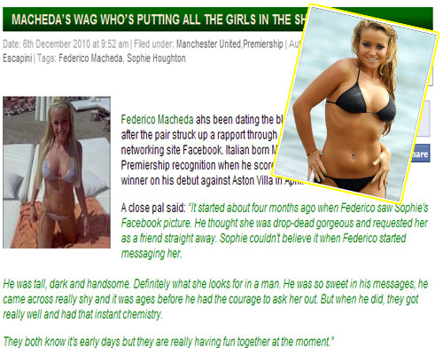 반면 뉴캐슬의 '트위터 역풍'과 다르게 '횡재'한 이도 있다. 바로 박지성의 동료인 '맨유의 신성' 마케다(19)다. 그는 최근 ‘페이스북’을 이용하던 중 2009년 미녀 대회 출신의 소피 휴턴과 우연히 친구를 맺는 과정에서 연인으로 발전했다.