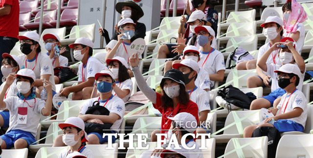 [더팩트ㅣ임영무 기자] 2020 도쿄올림픽 남자축구 조별리그 B조 1차전 대한민국과 뉴질랜드의 경기가 22일 오후(현지시간) 일본 이바라키 가시마 스타디움에서 열린 가운데 가시마 지역 초등학생들이 태극기가 그려진 부채를 들고 대표팀을 응원하고 있다.