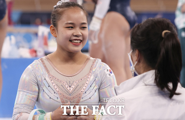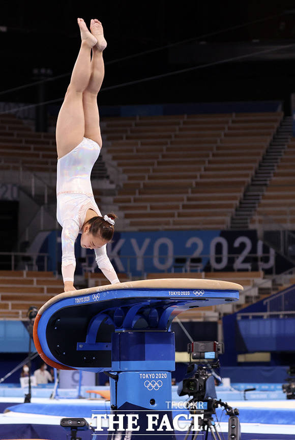 [더팩트ㅣ임영무 기자] 2020 도쿄올림픽 개막을 하루 앞둔 22일 체조 국가대표 여서정이 일본 도쿄 아리아케 체조 경기장에서 도마 연습을 하고 있다.