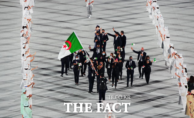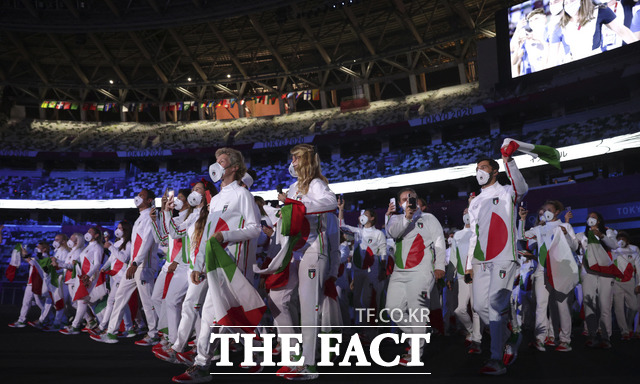 [더팩트ㅣ이새롬 기자] 23일 일본 도쿄 올림픽스타디움에서 열린 2020 도쿄올림픽 개막식에서 올림픽 발상지인 그리스의 선수단이 첫번째로 입장하고 있다.
