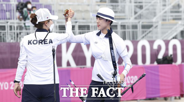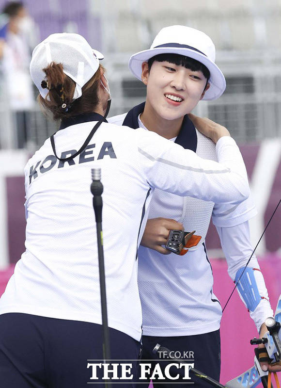 [더팩트ㅣ남용희 기자] 대한민국 양궁 대표팀 안산이 30일 일본 도쿄 유메노시마 양궁장에서 열린 '2020 도쿄올림픽' 양궁 여자 개인 16강전에서 일본으로 귀화한 하야카와 렌(한국명 엄혜련)을 세트 스코어 6대 4로 꺾으며 8강 진출에 성공했다.