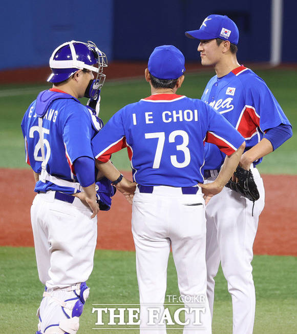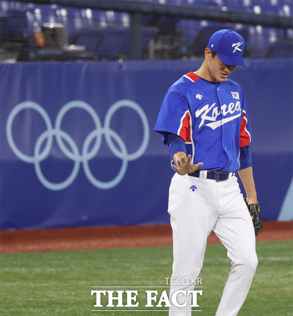 [더팩트ㅣ이선화 기자] '2020 도쿄올림픽' 야구 준결승전 한국과 일본의 경기가 4일 오후 일본 요코하마 스타디움에서 열린 가운데 3회말 한국 선발투수 고영표가 일본 사카모토 하야토의 외야플라이아웃 때 점수를 내준 뒤 아쉬워하고 있다.