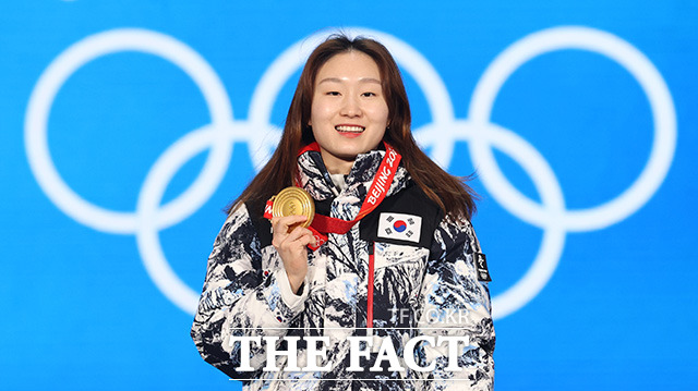 '올림픽 2연패' 최민정, 환한 미소로 들어보이는 금메달 [TF사진관]
