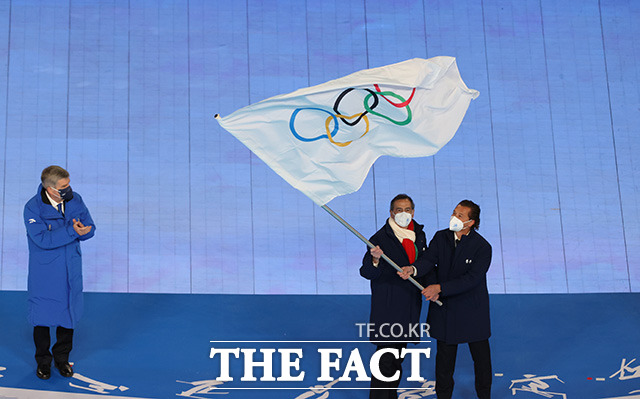 [더팩트ㅣ남용희 기자] 2022 베이징 동계올림픽 폐막식이 20일 오후 중국 베이징 국립 경기장에서 열린 가운데 차기 개최지인 이탈리아의 밀라노 주세페 살라 시장과 코르티나의 잔피에트오 게디나 시장이 올림픽기를 흔들고 있다.