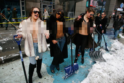 [ 이창규 기자] 뉴욕 맨하탄의 한 거리에 글래머 여성들이 상반신 누드 차림으로 눈을 치우는 사진이 공개돼 화제를 모으고 있다.