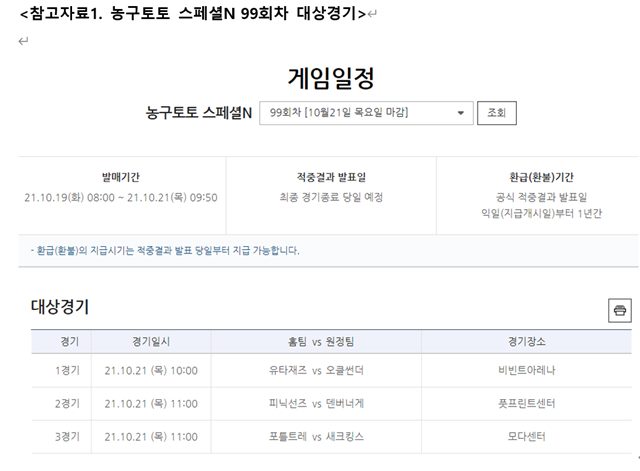 가장 먼저 마감되는 농구토토 스페셜N 99회차는 21일(목) 오전 10시에 비빈트아레나에서 펼쳐지는 유타-오클라호마(1경기)전을 비롯해 피닉스-덴버(2경기), 포틀랜드-새크라멘토(3경기)전을 대상으로 발행되며, 첫 경기 시작 10분 전인 21일 오전 9시50분까지 게임에 참여할 수 있다.
