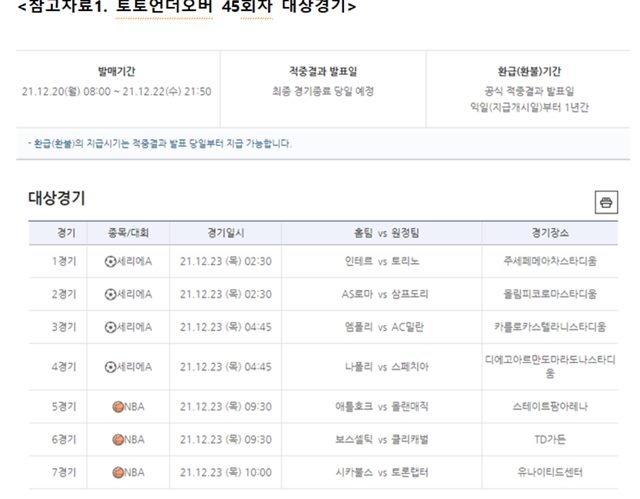 투표 방식의 경우 주어진 각 팀의 최종득점이 기준 값 미만이라면 언더(U)에 표기하면 되고, 초과한다면 오버(O)를 선택하면 된다. 이번 45회차의 경우 오는 23일(목)에 열리는 이탈리아 프로축구(세리에A) 4경기와 미국 프로농구(NBA) 3경기를 대상으로 토토팬들을 찾아간다.