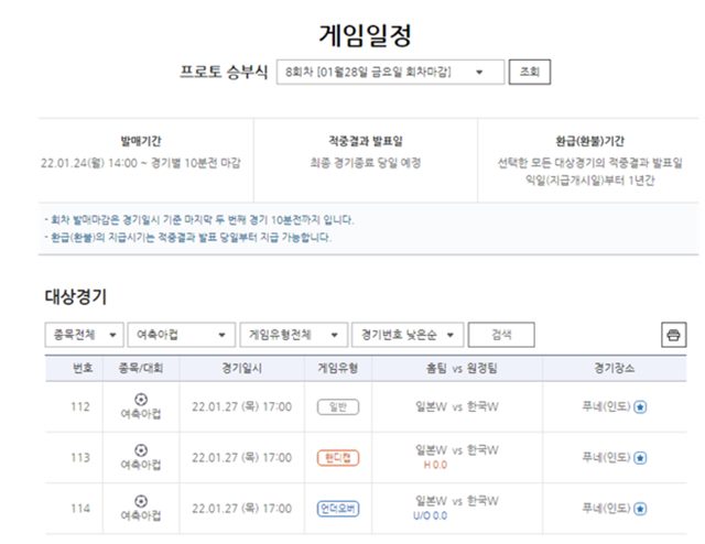 국민체육진흥공단에서 발행하는 체육진흥투표권 스포츠토토의 수탁사업자 스포츠토토코리아는 27일(목) 오후 5시 푸네(인도)에서 진행되는 여자 아시안컵 대한민국(원정)-일본(홈) 경기를 대상으로 프로토 승부식 8회차를 발매한다고 전했다.