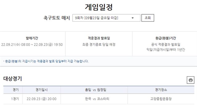 [더팩트 | 박순규 기자] 국민체육진흥공단에서 발행하는 체육진흥투표권 스포츠토토의 수탁사업자 스포츠토토코리아가 오는 23일(금) 밤 8시에 고양종합운동장에서 열리는 대한민국 남자 축구 국가대표팀 평가전 경기인 대한민국(홈)-코스타리카(원정)전을 대상으로 한 축구토토 매치 9회차 게임을 발매한다고 밝혔다.