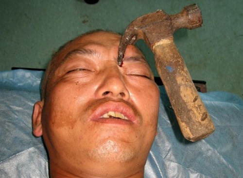 엑스레이 촬영으로 확인한 결과 망치가 그의 머릿속을 깊숙히 파고 들었다. 담당 의사는 망치를 제거한 수술을 마친 후 "아주 조금만 옆으로 맞았으면 눈을 다칠뻔 했다"며 "정말 운이 좋았다"고 설명했다.