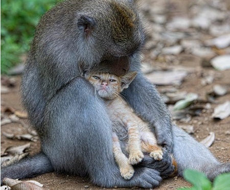 이 모습은 영국의 아마추어 사진 작가 앤 영이 찍었다. 공원에 방문한 영은 우연히 원숭이가 새끼 고양이를 품에 안고있는 모습을 발견했다. 품에 안긴 새끼 고양이 역시 편안한 모습으로 잠들어 있었다.