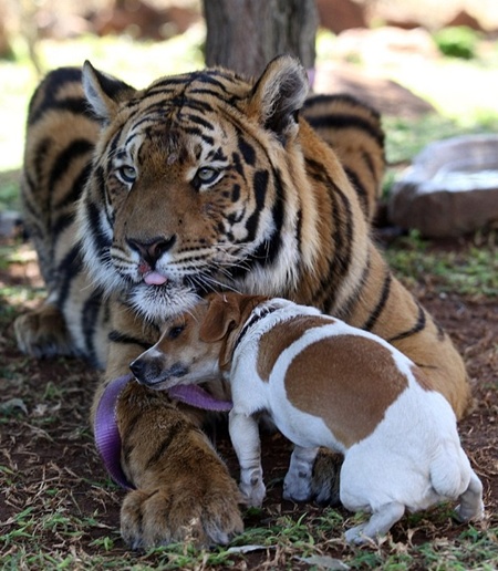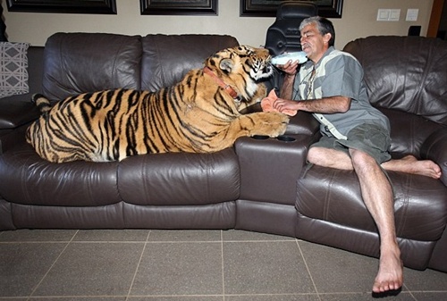 호랑이를 애완 동물로 키우는 남자가 있어 화제다. 영국 일간지 '데일리메일'는 지난 27일(한국시간) "사나운 뱅골 호랑이가 애완동물이 됐다"며 "젖병으로 우유를 먹고 주인에게 애교를 피우는 등 여느 애완 동물과 다르지 않다"고 전했다.