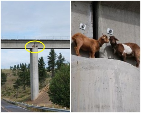 영국 일간지 '메트로'는 3일(한국시간) "미국 몬타나에 위치한 한 다리기둥 위에서 두려움에 떨고 있는 염소 2마리가 발견됐다"며 "목격 즉시 구조됐고 건강상태는 매우 양호한 편"이라고 보도했다.