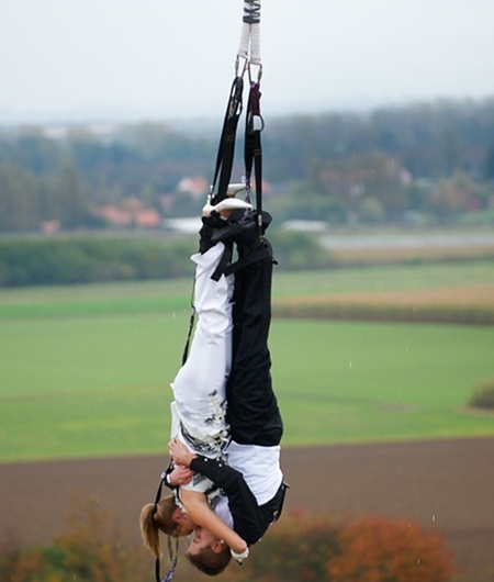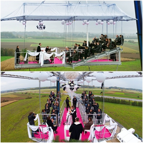 이색 공중 결혼식 주인공은 조웬과 산드라 키퍼. 두 사람은 평생에 한 번 뿐인 결혼식을 기념하기 위해 이런 상공에서 결혼하는 방법을 고안했다. 그리고 이를 위해 지상 50m 높이의 공중에 그들만의 예식장을 설치했다.