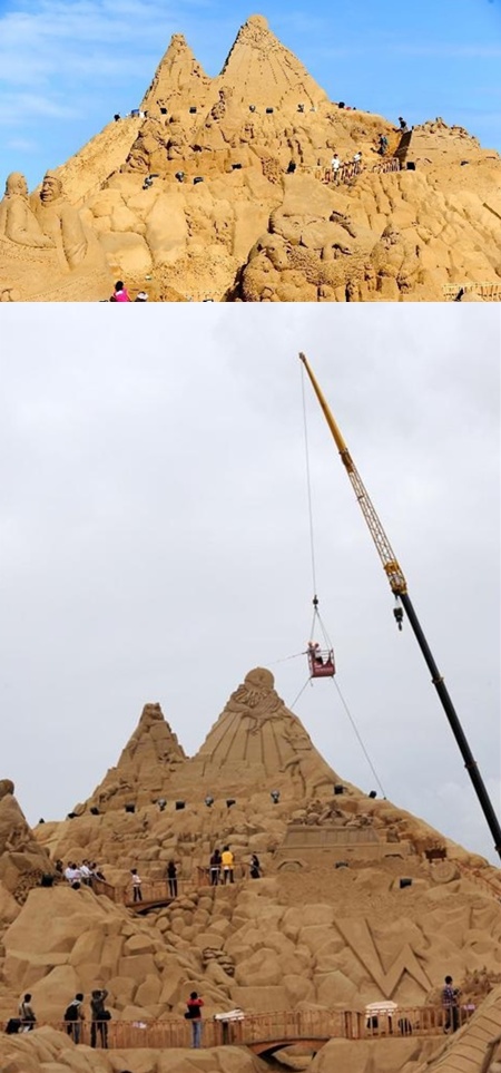 미국의 한 엽기사이트는 지난 30일(한국시간) "중국 제지앙에서 열린 모래 조각 축제에서 높이 약 22m를 자랑하는 조각이 공개됐다"며 "이는 세계에서 가장 높은 길이의 모래조각이다"고 전했다.