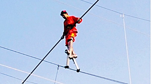 영국 온라인 매체 '오렌지'는 지난 1일(한국시간) "중국의 한 남성이 철제 인공 다리에만 의지해, 높이 20m의 상공에서 외줄타기 묘기를 선보여 세계 기록을 세웠다"고 보도했다.