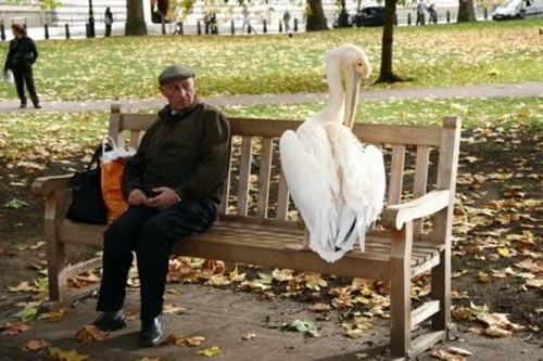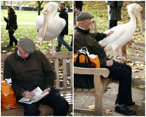 사진 속 노인과 펠리컨은 마치 친구같은 모습이었다. 둘은 공원 벤치에서 시간을 보냈다. 노인은 신문을 펴고 낱말 맞추기를 하고 있었다. 펠리칸은 그 주위를 맴돌며 노인을 보호하는 듯한 제스처를 취했다.
