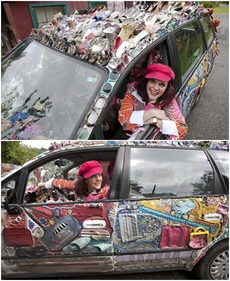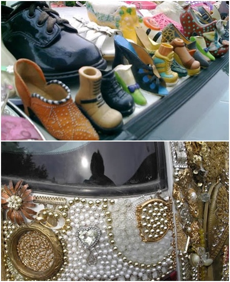차 위는 주로 구두와 선글라스로 꾸몄다. 하이힐부터 부츠까지 다양했다. 앞 유리창과 창문의 빈 공간은 선글라스로 채웠다. 옆면은 가방과 다양한 모양의 액세사리들이 장식됐다. 가방은 차가 달려도 떨어지지 않게 최대한 납작하게 만들어 부착했다. 목걸이를 만드는데 사용되는 구슬도 색상별로 붙였다. 마치 동화 속에 나오는 차를 보는 듯 했다.